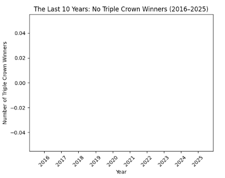 In fact, there were many talented horses with great pedigrees in the last 10 years, but none of them has been able to win all three Races of the Triple Crown since Justify in 2018. The chart clearly highlights this gap. We can see that every year from 2016 to 2025 there are no winners at all.