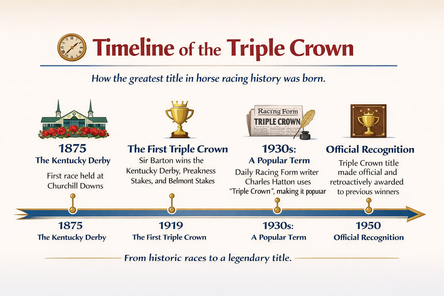 In 1950, the Triple Crown title was made official. At that time, Sir Barton and the preceding winners were officially acknowledged as Triple Crown champions. Since that moment, the Triple Crown became a fixture in and a highly esteemed part of American sports history.