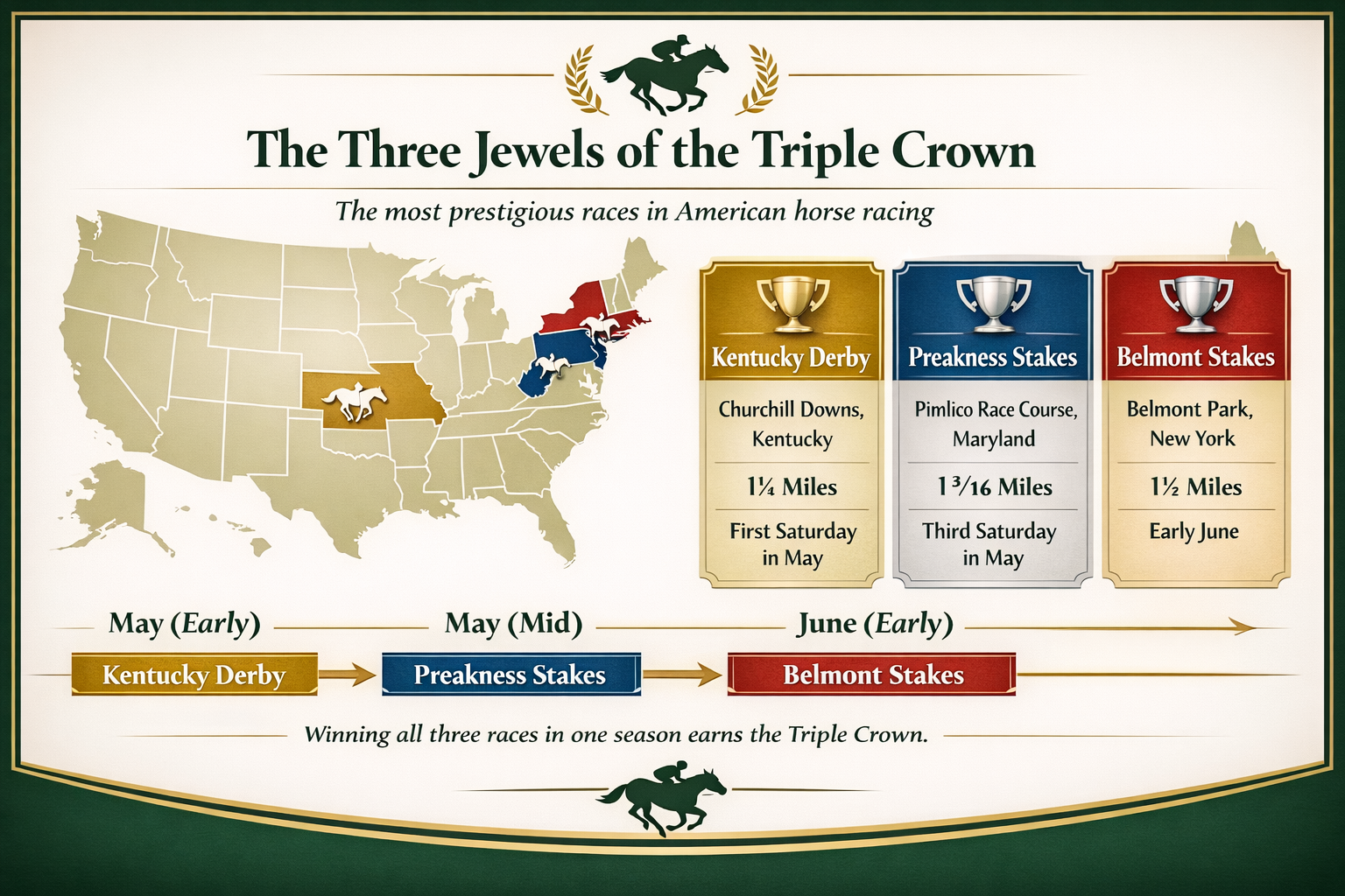 Each race challenges a different skill, so the horse that wins the Triple Crown has to be excellent at all of them.